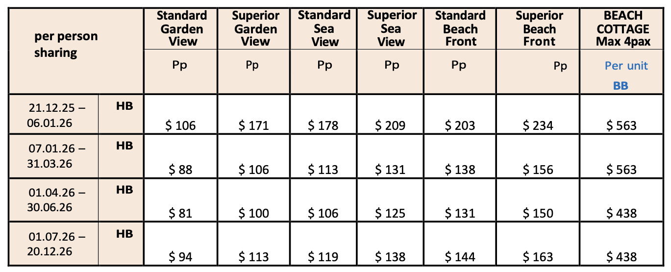 | Standard Room | Superior Room | Standard Beach Room | Superior Beach Room | ||||||
